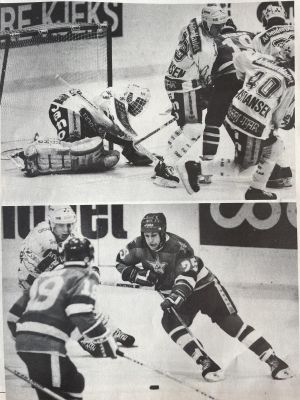 Vålerengen fikk kampens første sjanse etter kun tjue sekunder da Petter Thoresen hadde et farlig skudd som Belosheiken reddet. Stemningen i den fullsatte amfien sto i taket. Første periode var en jevnspilt affære og Vålerengens keeper Jim Marthinsen storspilte. I begynnelsen av andre periode gjorde Petter Thoresen en kjempetabbe. Fra bak eget mål serverte han Igor Larionov slik at han fikk stå helt alene med Jimmern og legge pucken pent i krysset. 1-0 til sovjetrusserne etter 54 sekunder. Vålerengen fortsatt å gi CSKA Moskva god motstand og etter hvert så skjønte sovjetrusserne at de måtte gire opp tempoet.